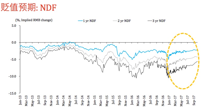 巫厚玮对记者表示,“下半年以来,美元走弱的同时,对人民币贬值的预期也在走弱。根据NDF(无本金交割远期外汇),市场对于1年期、2年期和3年期人民币远期汇率的贬值预期已经纷纷缓解。”