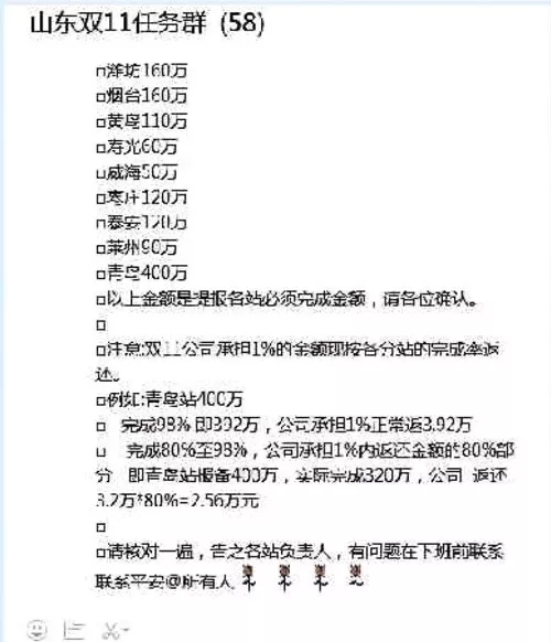 周栋东举报信中的相关证据显示,家装e站山东双11任务群中一位网名叫“jzez,平安”的工作人员在双十一之前就发布了2016年双十一的任务量,共涉及20个县(区)市,拍单总任务量是2564.04万元,其中青岛400万元,济南180万元。