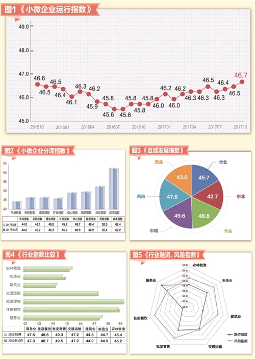 2017年10月份,“经济日报—中国邮政储蓄银行小微企业运行指数”(见图1)为46.7,较上月上升0.2个点,表明本月小微企业运行稳中向好。