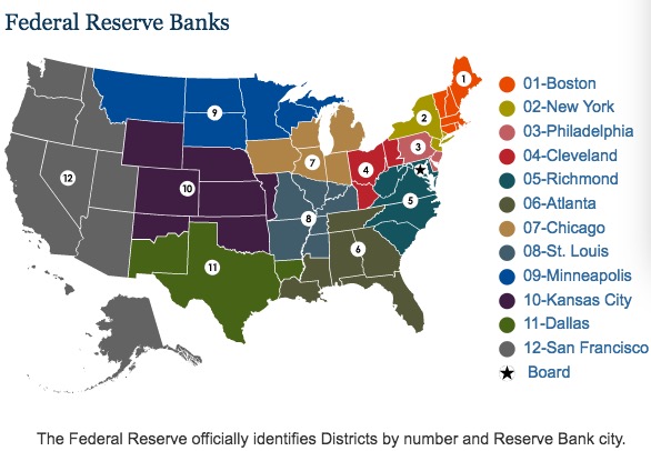 与七名委员并行的还有12家联储分行,12个联邦储备区对应的联邦储备银行的所在城市,分别为:波士顿、纽约、费城、克利夫兰、里士满、亚特兰大、芝加哥、圣路易斯、明尼阿波利斯、堪萨斯城、达拉斯及旧金山。