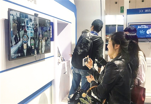 在今年的腾讯全球合作伙伴大会上,用户在尝试由人工智能图像识别能力支持的“变脸”功能。本报记者 陈 静摄