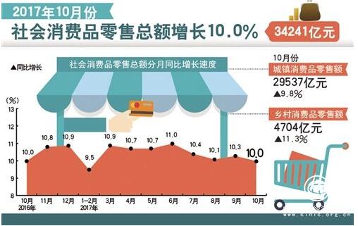 ——从生产看,规模以上工业增加值同比增速加快0.1个百分点;服务业生产指数同比增速加快0.2个百分点。从需求看,社会消费品零售总额同比增速持平;前10个月固定资产投资增速虽比1至9月份略有回落,但投资在优化供给结构方面的作用持续发挥;10月份出口同比增长6.1%,而上年同月出口下降了3.8%。