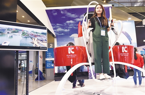 11月16日,观众在第十九届中国国际高新技术成果交易会的光启科学展台体验“马丁飞行包”。 当日,第十九届中国国际高新技术成果交易会在深圳开幕。新华社记者 毛思倩摄