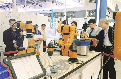 在第十九届工博会上,中国工程院院士倪光南(右一)在遨博智能科技有限公司展台观看其展出的具有自主知识产权的最新工业协作机器人。记者 许红洲摄