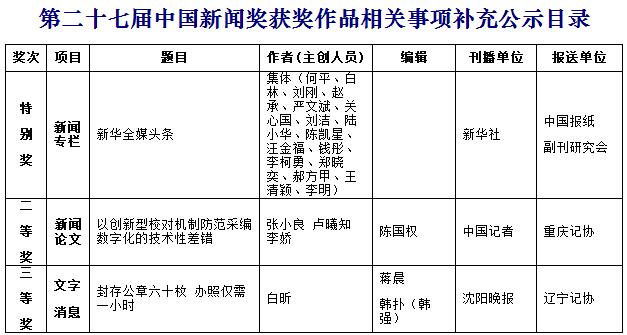 根据《中国新闻奖评选办法》规定,现就第二十七届中国新闻奖获奖作品相关事项进行补充公示: