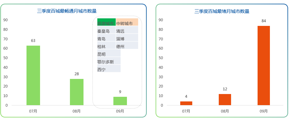 从时间上看,由于三季度包含了暑期与开学季,具有非常明显的拥堵规律。其中暑期7月为最畅通月,百城中有63个城市为最畅通月,暑假特征明显;而作为开学季的“最堵9月”则有84个城市为最拥堵月份。但由于城市功能不同,青岛、桂林、昆明、清远等部分旅游型和中转型城市在“最堵9月”仍然任性的畅通,成为其在本季度的最畅通月份。