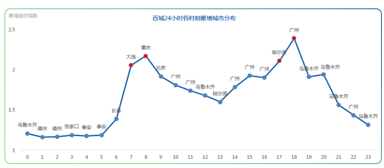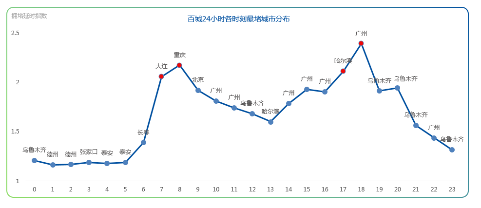 从日均各时段的拥堵的城市分布来看,早高峰7点-8点时段最拥堵的城市为大连、8点-9点最拥堵城市为重庆;晚高峰17-18点时段哈尔滨最拥堵,18点-19点广州最拥堵。24小时中,乌鲁木齐和广州出现次数最多,乌鲁木齐6个时段最堵且主要分布在晚上,而广州有6个时段主要分布在白天非高峰期和1个时段分布在高峰期。