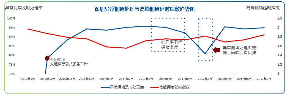 深圳交警积极推进智能交通管理系统建设,利用互联网手段处理异常拥堵达到95%以上,排名全国第一。而高德的交通信息公共服务平台中的互联网+异常拥堵处理功能可有效协助深圳交警监控异常拥堵道路,使深圳交警可以利用大数据快速准确发现异常拥堵的位置,再结合交警的及时出警处理,有效解决城市拥堵。从2016年10月至今,深圳交通拥堵大幅缓解,拥堵排名由去年三季度的第15下降至今年的第28,拥堵的缓解与异常拥堵及时处理关系密切。
