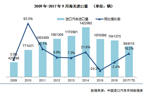 由于回补库存需求,今年1-9月,中国累计进口汽车88.4万辆,同比增长18.2%,相比去年全年3.4%的负增长,回升21.6个百分点。经销商交付客户进口销量为66.4万辆,同比增长1.9%,扭转了2015-2016年的下滑态势,但复苏态势较弱。