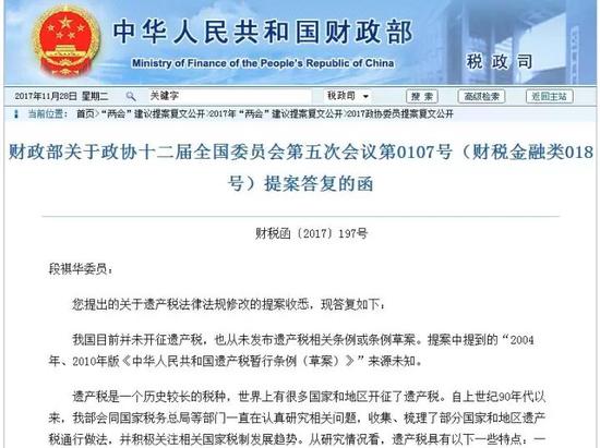 10月17日,财政部在其网站公布《财政部关于政协十二届全国委员会第五次会议第0107号(财税金融类018号)提案答复的函》。该函回答了全国政协委员段祺华关于遗产税法律法规修改的提案的相关问题。