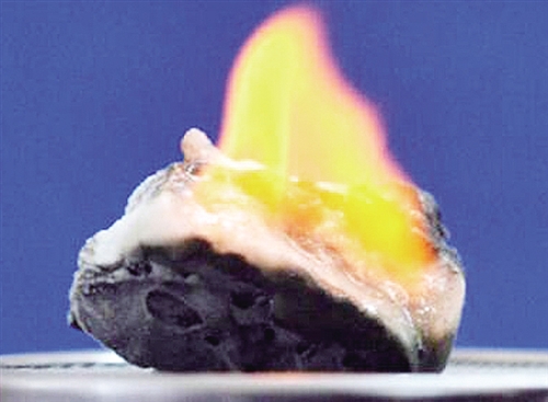 俗话说水火不相容。但是有这样一种冰,不仅可以燃烧,其热值还比石油多10倍,燃烧后很清洁,只生成二氧化碳和水,储量据称可供人类使用千年。这就是可燃冰,学名叫做“天然气水合物”,也被人称作“固体甲烷”,是甲烷为主的有机分子被水分子包裹而成,既含水又呈固体,看起来像冰,很容易被点燃。