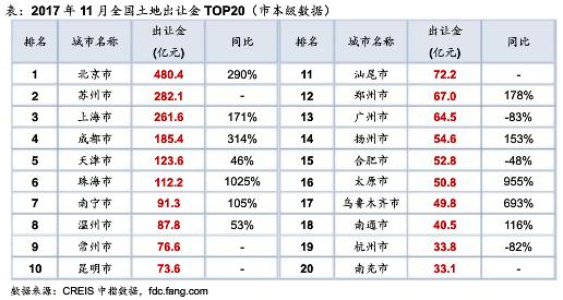 11月出让金TOP20排行榜: 北京揽金480亿元蝉联榜首