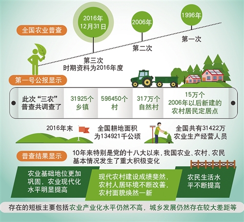 自2015年6月份起,国务院决定开展第三次全国农业普查。此次普查的标准时点为2016年12月31日,时期资料为2016年度,共调查了31925个乡镇,其中乡11081个,镇20844个;596450个村,其中556264个村委会,40186个涉农居委会;317万个自然村;15万个2006年以后新建的农村居民定居点。