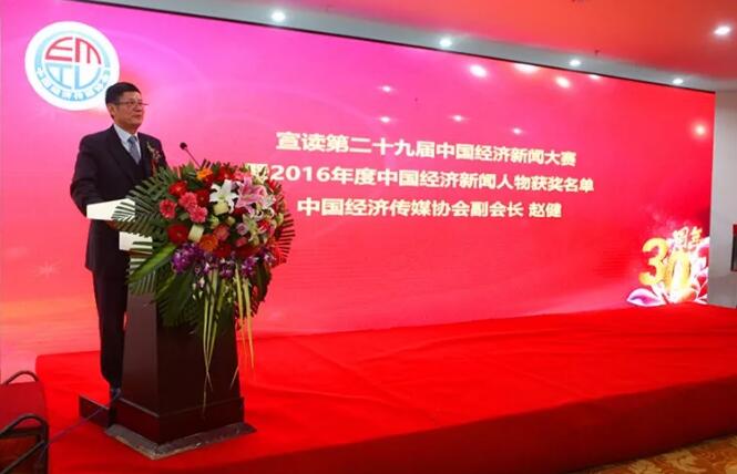 中国经济传媒协会副会长赵健宣读第二十九届中国经济新闻大赛暨2016年度中国经济新闻人物获奖名单