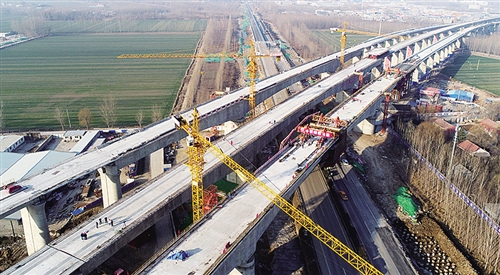 12月20日,济(南)青(岛)高铁跨济(南)广(州)高速128米连续梁完成全部合龙,标志着济青高铁的线下工程全线贯通。 (新华社发)