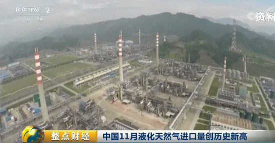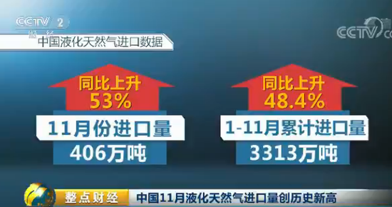 中国海关周六公布的数据显示,我国11月份液化天然气进口量达到了406万吨,同比上升53%,创下历史新高。而1到11月份液化天然气进口累计上升了48.4%,达到了3313万吨。