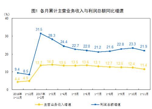 11月份,规模以上工业企业实现利润总额7858.2亿元,同比增长14.9%,增速比10月份放缓10.2个百分点。