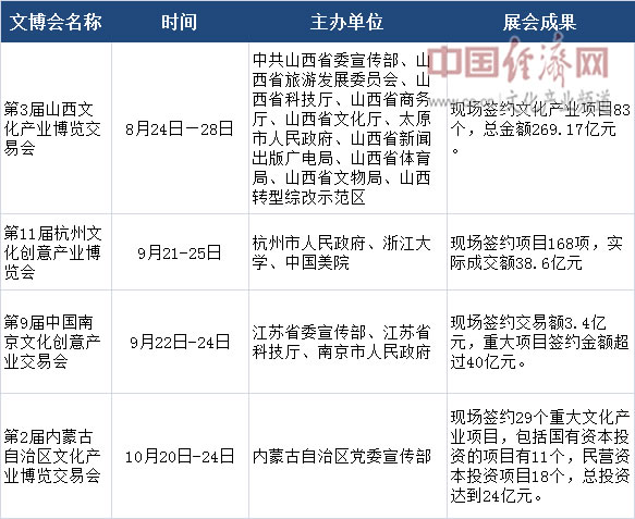 在这4场文博会中又以第3届山西文化产业博览交易会的现场签约金额为最。据山西日报报道,第3届山西文化产业博览交易会以“文化三晋开放山西”为主题,在前两届的基础上重点突出“两个转变”,即由展产品向更加注重展项目展企业展园区转变,由展览博览为主向展览博览与交易招商并重转变。本届山西文博会邀请了来自北京、上海、广东、云南等20多个省区市、港澳台以及俄罗斯、英国、法国等10多个国家和地区的参展商,前来参展交流,进行交易活动。展会推出招商项目238个,总投资1218亿元;拟签约项目83个,签约额269亿,涵盖媒体融合、文化旅游、文化创意、文化园区、特色文化小镇等领域。相较第2届山西文化产业博览交易会,本届山西文化产业博览交易会签约金额取得明显增长。据了解,第2届山西文化产业博览交易会共推出招商项目356个,签约项目77个,签约引资金额182亿元;主场馆现场成交额突破1.6亿元,达成合作意向金额突破35亿元。