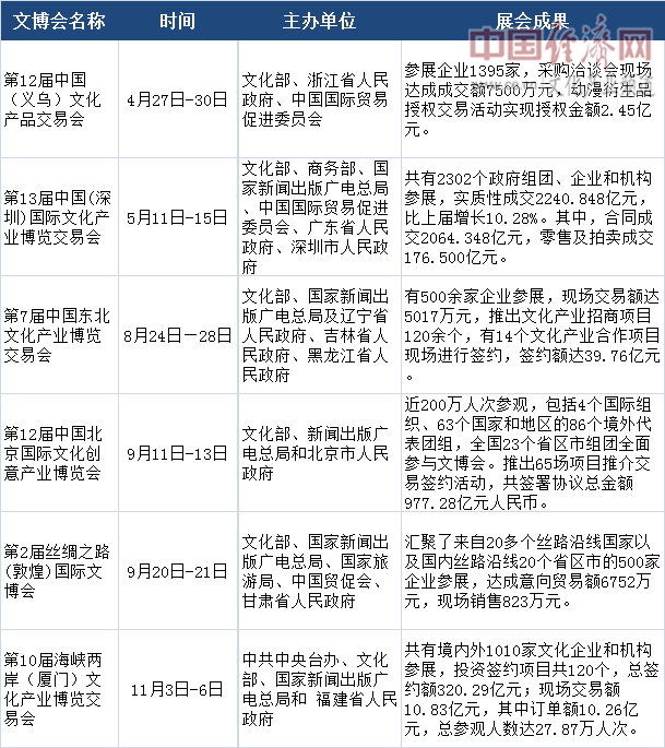 第三,从实现的交易量和达成的合作金额可以看出,这6场文博会成交量斐然,社会效益和经济效益双丰收。比如第13届中国(深圳)国际文化产业博览交易会共有2302个政府组团、企业和机构参展,实质性成交2240.848亿元,比上届增长10.28%。其中,合同成交2064.348亿元,零售及拍卖成交176.500亿元。第12届中国北京国际文化创意产业博览会参观人数达近200万人次,包括4个国际组织、63个国家和地区的86个境外代表团组,全国23个省区市组团全面参与文博会,共推出65场项目推介交易签约活动,签署协议总金额达977.28亿元人民币。第10届海峡两岸(厦门)文化产业博览交易会共有境内外1010家文化企业和机构参展,投资签约项目共120个,总签约额320.29亿元;现场交易额10.83亿元,其中订单额10.26亿元,总参观人数达27.87万人次。第7届中国东北文化产业博览交易会有500余家企业参展,现场交易额达5017万元,推出文化产业招商项目120余个,有14个文化产业合作项目现场进行签约,签约额达39.76亿元。第12届中国(义乌)文化产品交易会参展企业1395家,采购洽谈会现场达成成交额7500万元,动漫衍生品授权交易活动实现授权金额2.45亿元。第2届丝绸之路(敦煌)国际文博会汇聚了来自20多个丝路沿线国家以及国内丝路沿线20个省区市的500家企业参展,达成意向贸易额6752万元,现场销售823万元。
