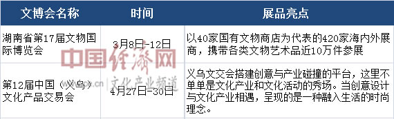 湖南省文物国际博览会不言而喻是侧重文物领域的文博会。在湖南省第17届文物国际博览会上,以40家国有文物商店为代表的420家海内外展商,携带各类文物艺术品近10万件参展。据国家文物局网站报道,在湖南省第17届文物国际博览会上,一串标价12.8万元的翡翠雕花十八子手串以12万元成交,买家从上手看货、讨价还价到刷卡付账、提货,不足10分钟。