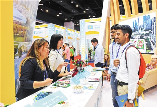 9月14日,在广西南宁国际会展中心,哈萨克斯坦参展商(左)和巴基斯坦参展商交流。 新华社记者 陆波岸摄