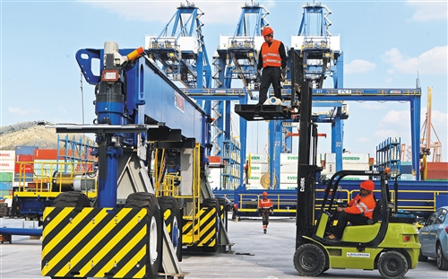 这是2017年3月17日拍摄的中远海运集团希腊比雷埃夫斯港集装箱码头一角。