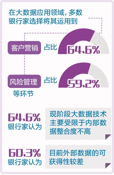 调查结果显示,在大数据应用领域,多数银行家选择将其运用到客户营销、风险管理等环节,占比分别高达64.6%、59.2%,这在一定程度上反映出银行家对于加大业务拓展、提升经营管理水平的重视程度。