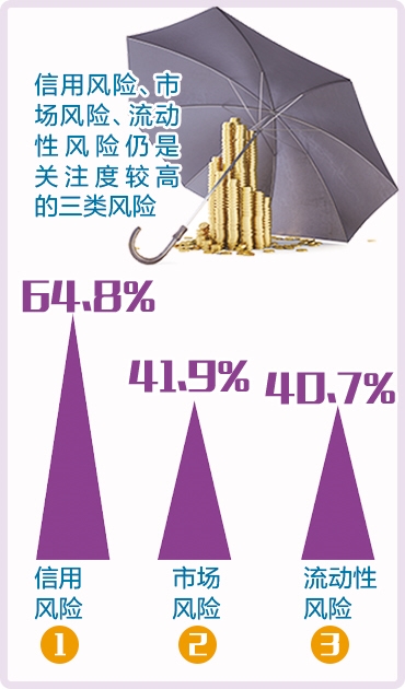 具体哪些风险在2017年备受银行家关注呢?调查结果显示,信用风险、市场风险、流动性风险仍是关注度较高的三类风险,分别占比64.8%、41.9%、40.7%。