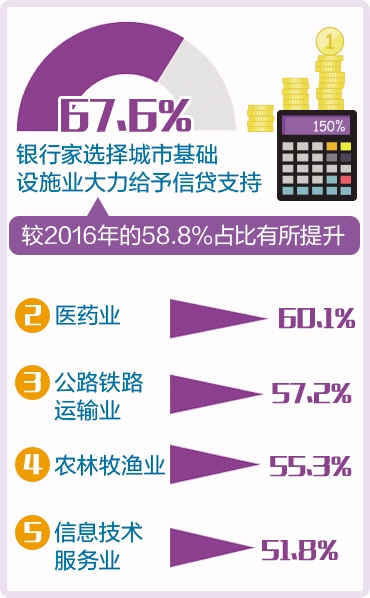 具体来看,有67.6%的银行家选择对城市基础设施业大力给予信贷支持,较2016年的58.8%占比有所提升,医药业、公路铁路运输业、农林牧渔业、信息技术服务业则依次位列第二至第五位,分别有60.1%、57.2%、55.3%、51.8%的银行家对其表示青睐,占比较2016年也出现较大幅度提升。