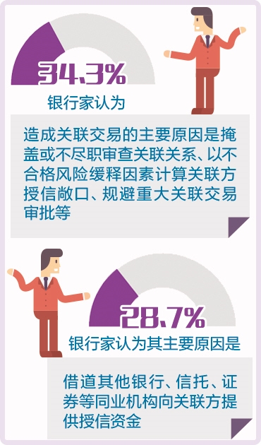 调查显示,34.3%的银行家认为,造成关联交易的主要原因是掩盖或不尽职审查关联关系、以不合格风险缓释因素计算关联方授信敞口、规避重大关联交易审批等;28.7%的银行家认为其主要原因是借道其他银行、信托、证券等同业机构向关联方提供授信资金。