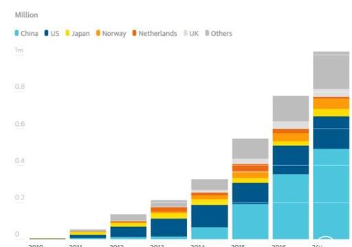 按照上述趋势,如果2018年电动汽车销量将达到170万到200万辆,到2018年年底全球的保有量将有望超过500万。