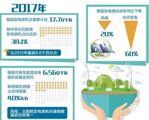 “2017年,我国发电装机总量累计达17.7亿千瓦,其中非化石能源发电装机占比达到38.1%,比2012年提高9.6个百分点,是历史上增长最快的时期。”国家能源局局长努尔·白克力透露,2017年,我国可再生能源发电装机容量约6.56亿千瓦,新增装机规模占全球增量40%左右。风电、太阳能发电装机在建规模稳居世界第一,成为全球非化石能源发展的引领者。