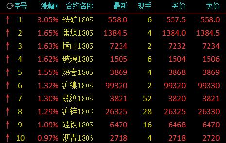截止中午收盘,铁矿涨3.05%,焦煤涨1.65%,锰硅涨1.63%;跌幅方面,淀粉跌0.98%,苹果跌0.92%,PVC跌0.88%。