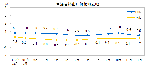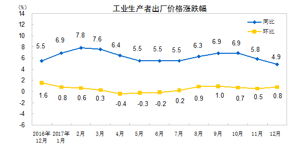 2017年12月份,全国工业生产者出厂价格同比上涨4.9%,环比上涨0.8%。工业生产者购进价格同比上涨5.9%,环比上涨0.8%。2017年全年,工业生产者出厂价格同比上涨6.3%,工业生产者购进价格同比上涨8.1%。