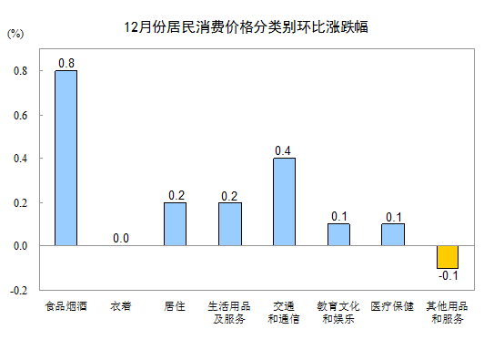 12月份,其他七大类价格环比五涨一降一平。其中,交通和通信价格上涨0.4%,居住、生活用品及服务价格均上涨0.2%,教育文化和娱乐、医疗保健价格均上涨0.1%;其他用品和服务价格下降0.1%;衣着价格持平。