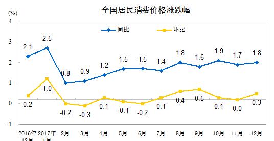 2017年12月份,全国居民消费价格同比上涨1.8%。其中,城市上涨1.9%,农村上涨1.7%;食品价格下降0.4%,非食品价格上涨2.4%;消费品价格上涨1.1%,服务价格上涨3.0%。