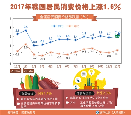 2017年全年,CPI同比上涨1.6%,涨幅比2016年回落0.4个百分点,重新回到“1时代”。食品价格下降1.4%,是自2003年以来首次出现下降,主要受猪肉和鲜菜价格下降较多影响。非食品价格上涨2.3%,涨幅比上年扩大0.9个百分点,其中,工业消费品价格上涨1.7%,服务价格上涨3.0%。