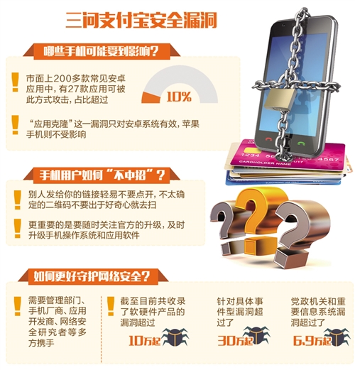 尽管现在支付宝已经修复了这一漏洞,但腾讯安全玄武实验室与知道创宇404实验室1月9日披露的攻击威胁模型“应用克隆”仍令人十分震惊。腾讯安全玄武实验室负责人于旸表示:“该攻击模型是基于移动应用的一些基本特点设计的。所以,几乎所有移动应用都适用该攻击模型。”研究显示,市面上200多款常见安卓应用中,有27款应用可被这种方式攻击,占比超过10%。