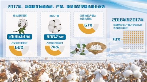 2017年,新疆棉花种植面积、产量、质量均呈现稳步增长态势,棉花播种面积2896.61万亩,占全国比重超过60%;棉花产量408.2万吨,占全国比重超过74%;优质棉花产量占全国比重达67%。新疆棉花总产量占全国比重连续两年超过70%,这表明新疆棉花成为国内棉花供给重要支柱,“一枝独秀”的供给格局已经形成——