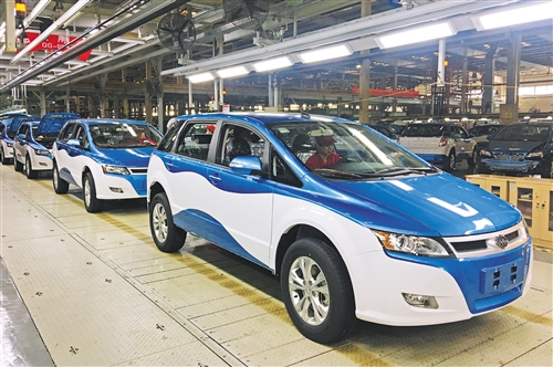 一辆辆比亚迪E6电动汽车正在从深圳总装工厂驶下生产线。
