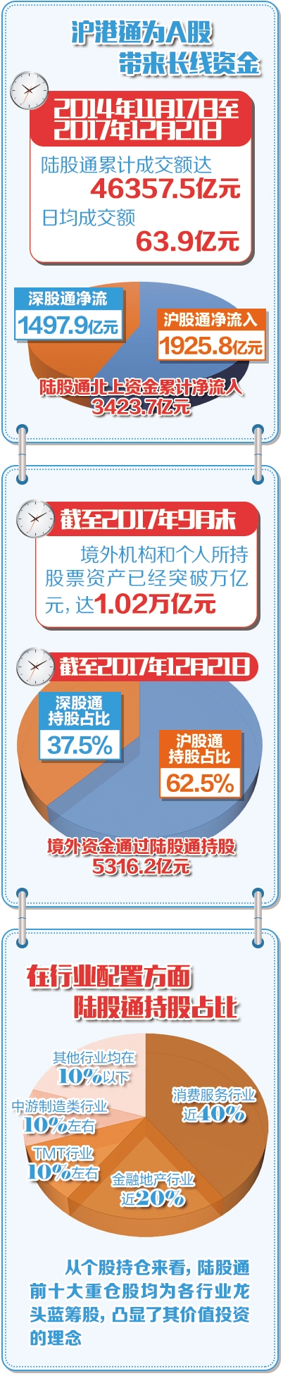 沪港通为A股带来长线资金。2014年11月17日至2017年12月21日,陆股通累计成交额达46357.5亿元,日均成交额63.9亿元:其中,沪股通成交额36764.5亿元,深股通成交额9593亿元。陆股通北上资金累计净流入3423.7亿元:其中,沪股通净流入1925.8亿元,深股通净流入1497.9亿元。