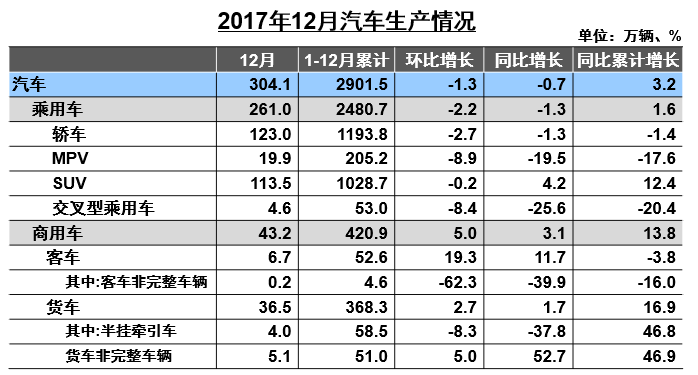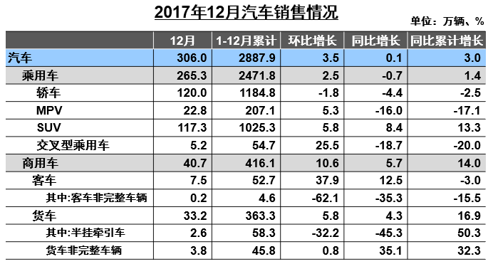 数据显示,2017年12月,我国汽车共生产304.1万辆,同比下降0.7%,环比下降1.3%;销售306万辆,同比增长0.1%,环比增长3.5%。2017年,我国汽车产销分别完成2901.5万辆和2887.9万辆,比上年同期分别增长3.2%和3%,低于上年同期11.3和10.6个百分点。2017年月度销量除4月、5月外,其余月份销量均高于上年同期,前三个季度基本符合年初的预期。由于上年基数较高,进入四季度产销增速出现明显回落,全年增速回落至3%。