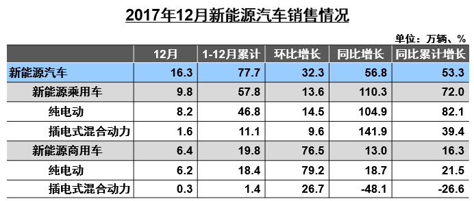2017年,我国新能源汽车产销为79.4万辆和77.7万辆,同比分别增长53.8%和53.3%。许海东表示,2017年新能源车产销均接近80万辆,首先是年底处于政策变化期,刺激了消费者的购车欲。其次,三四线城市在年底也进入了购车的高峰期,新能源车因此受益。