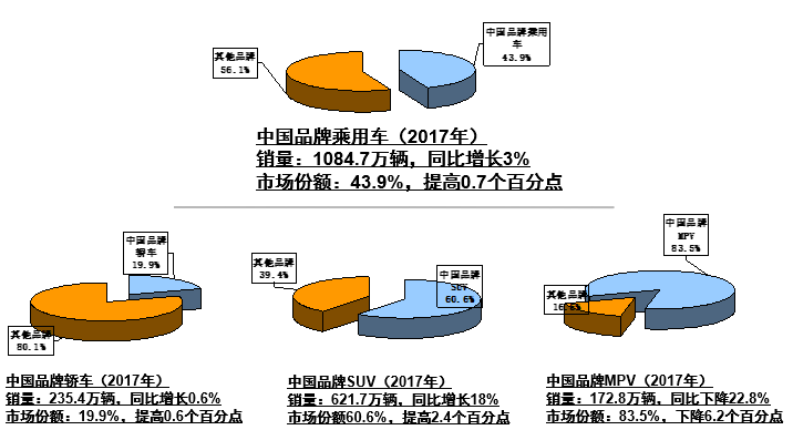 2017年,自主品牌乘用车销量为1084.7万辆,同比增长3%,市场份额提升0.7个百分点,达到43.9%。其中,SUV增长迅猛,轿车品牌表现稳定,MPV出现大幅下滑。2017年,自主品牌SUV共销售621.7万辆,同比增长18%;轿车共销售235.4万辆,同比增长0.6%;MPV共销售172.8万辆,同比下滑22.8%。