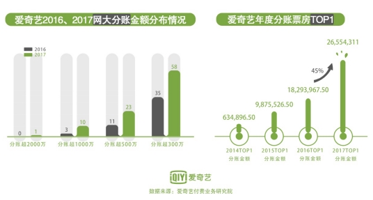 2017年对中国电影市场来说,是回归理性、走向成熟的转折年。这一年,院线电影总票房达559亿元,同比增长13.45%。《战狼2》以56亿内地票房,成为华语电影票房新冠军;《羞羞的铁拳》《功夫瑜伽》《西游伏妖篇》《芳华》等华语电影票房均超过10亿大关;此外,2017年华语电影还涌现了《二十二》《冈仁波齐》《相爱相亲》《绣春刀2》《闪光少女》等多元口碑作品。院线电影打开新的局面的同时,网络电影市场也正经历裂变式成长,并且变化之势更加凶猛。2017年中国网络大电影(以下简称“网大”)全网上线内容,出现首次同比数量下降,从内容到公司都经历了一番数据可见的大浪淘沙。数量下降的同时,《斗战圣佛》凭借高度商业化的市场运作,其在爱奇艺平台获得超2655万元的网络票房分账,创造中国网络票房分账历史新高点 ;《缞神契约》《哀乐女子天团》《星游记》《孤岛终结》《海带》《暴走刑警》等口碑佳作,也逐渐在大众领域获得高关注、高口碑。越来越多优秀的青年电影人,通过网络发行直面观众,找到创作话语权和打开市场的钥匙。