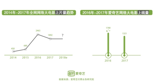 中国网大市场总分帐和头部内容分账持续增长,市场上升发展态势依然强势。2017年,全网上线网大约1900部(2016年该数据为2500部),爱奇艺上线1321部(2016年该数据为1780部)。