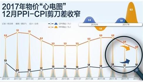 国家统计局1月10日发布的数据显示,2017年12月CPI同比上涨1.8%,相比上月回升0.1个百分点。PPI同比上涨4.9%,回落0.9个百分点。在此情况下,PPI-CPI剪刀差明显收窄,这将有利于成本上涨向下游行业转嫁,也有助于中下游行业的盈利改善。