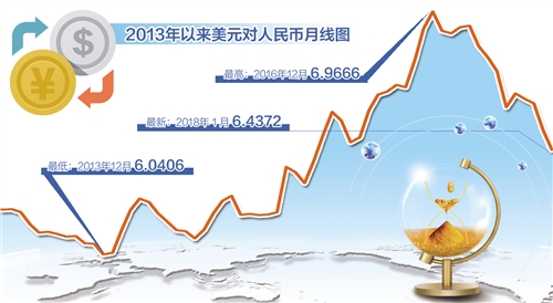 2018年新年以来,人民币对美元汇率一路走高,短短半个月时间最高涨幅一度超过1.2%,2017年全年人民币上涨幅度为6.72%。1月15日,离岸市场人民币对美元盘中最高触及6.4155元,创2015年11月25日以来新高。