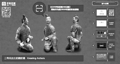同样在2017年,秦始皇帝陵博物院与百度联合启动“百度AI秦始皇兵马俑复原工程”项目。观众只需通过手机百度AR功能扫描兵马俑二号坑“平面布局图”“跪射俑灯箱”“铜车马结构图”3个触发物,就可以亲眼目睹“活”起来的兵马俑等文物。