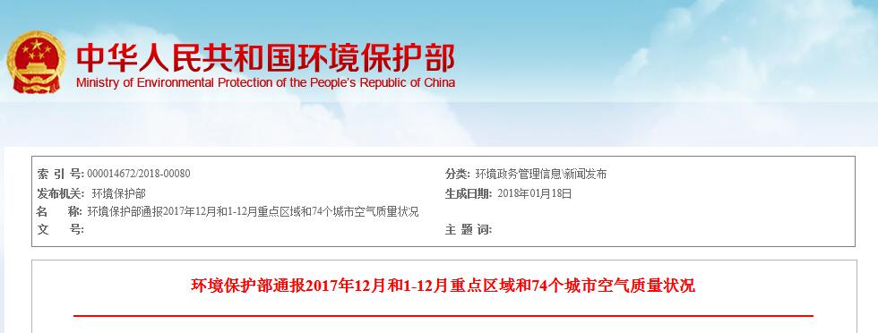 经济日报-中国经济网北京1月18日讯(记者 杨淼) 经济日报-中国经济网记者从环保部网站获悉,环保部今日向媒体公布了2017年12月和1-12月全国和京津冀、长三角、珠三角区域及直辖市、省会城市、计划单列市空气质量状况。具体来看,1-12月,平均优良天数比例为78.0%,同比下降0.8个百分点。PM2.5浓度为43微克/立方米,同比下降6.5%。京津冀区域13个城市12月平均优良天数比例为64.6%,同比上升34.1个百分点。